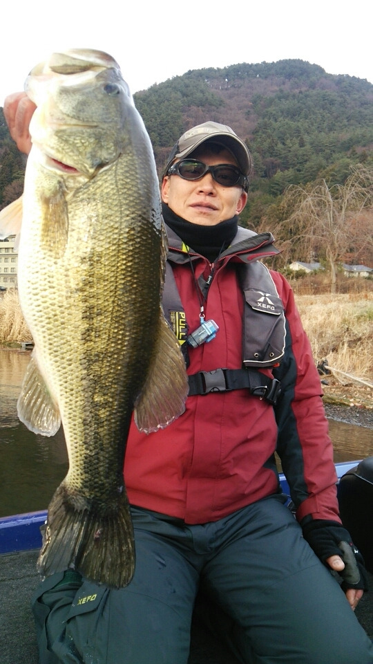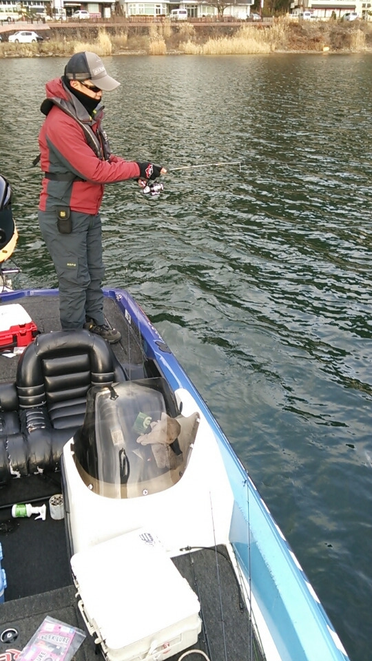 午後は冷たい風が吹いてきて、ベイトやギルも一段レンジが下がった為、ジグヘッドのミドストでチェックしていくと数ヵ所目で加藤様にビッグバイト